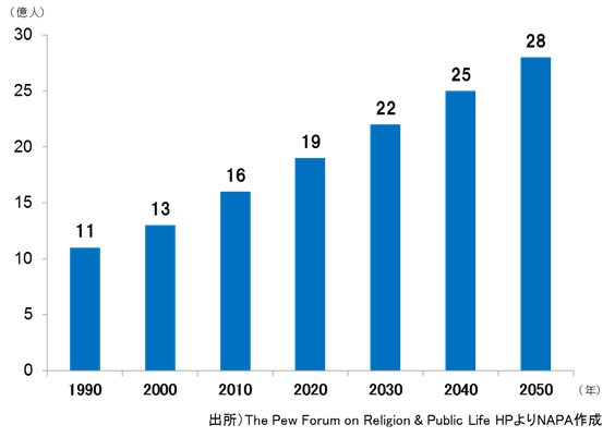 イスラム教徒の人口は2011年時点で18億人に達しており、世界の人口の4人に1人となっている。2050年には28億人に達すると推測されており、世界の人口の3人に1人に達すると推測されている。東南アジアではイスラム教徒の人口は7億5,000万人に上っており、特に最近注目されているのがインドネシアとマレーシアである。インドネシアは総人口2億4,000万人のうち2億人がイスラム教徒であり、国別のイスラム教徒の人口でも1位である。また、マレーシアは総人口2,400万人のうち2,000万人がイスラム教徒である。