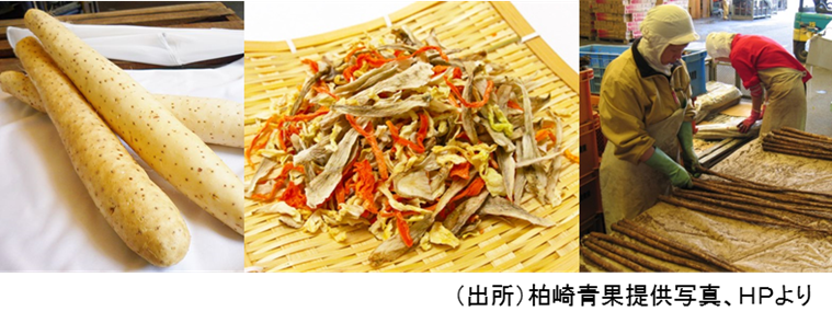 有限会社柏崎青果は10haの農地にて、にんにく3ha、ながいも2ha、ごぼう1ha、玉ねぎ1.3ha等を生産している。また、県内の契約農家50戸やJA生産部会とも連携して農産物を仕入れており、年間取扱量はながいも2,500t、にんにく400t、ごぼう600t、だいこん600tにも上り、年間を通して供給できる体制を構築している。