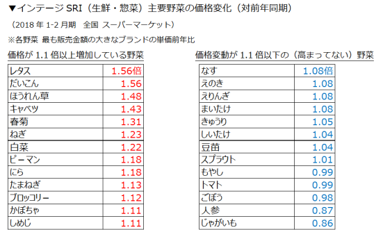 全国のスーパー600店舗の販売データである「インテージSRI(生鮮・惣菜)」から主要野菜の価格状況を確認した結果が下記になります。