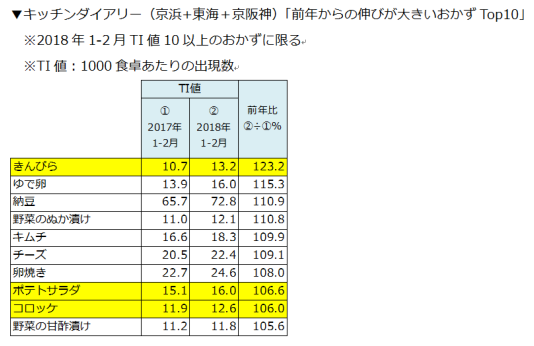 キッチンダイアリー(1260世帯の食卓調査)から、野菜価格が高騰している2018年1-2月における主要メニューの状況を確認してみました。