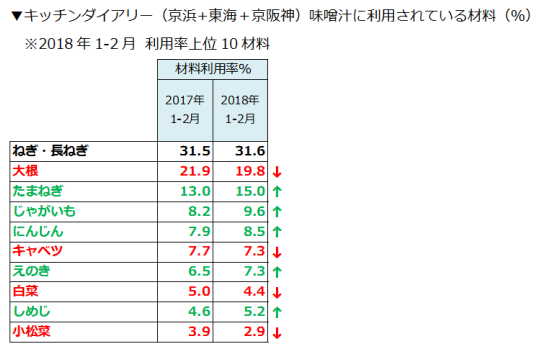 味噌汁の代表食材と言っても良い「大根」ですが、価格高騰の2018年1‐2月の味噌汁利用率は20%を下回り19.8%となってしまいました。その他にも「キャベツ」や「白菜」といった価格高騰野菜は、味噌汁に使われる頻度が下がってしまっている事が確認できます。