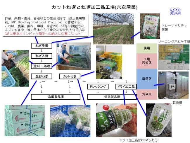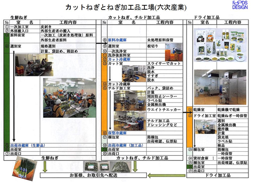 図の右に収穫したネギが入ってくる。選別し、根切りするまでが一般作業ゾーン(汚染ゾーン)で、ここで処理した生鮮ねぎのまま箱詰めされて出荷に行くルートがある。もう一つのルートは、準清潔ゾーンで一次洗浄したあと、清潔ゾーン(衛生ゾーン)に入り、カットねぎに加工される。更にここからのルートは、ドレッシングや乾燥ネギ製品へとなっていく。