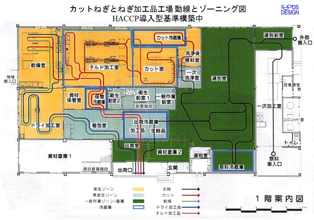 ねぎ加工工場の図面だが、衛生管理対応と、製造効率化に対応している。