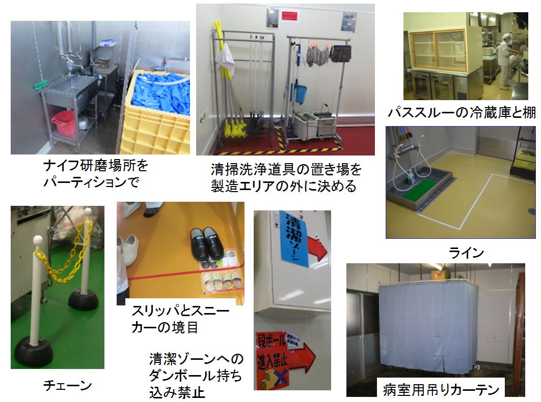 パーティション(衝立)、ライン、パススルーの棚や冷蔵庫、チェーン、表示、簡易カーテンなどで出来る。