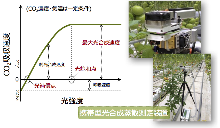冬季の日射量が少ないオランダでは、天井部に設置された高圧ナトリウムランプによる補光を行うのが一般的にひろがっています。上の図は、個々の葉の光合成速度と光強度の相関関係を表したものです。夜間や雨天・曇天日の補光は光合成促進に極めて有効で、個体群の光合成は個葉光合成の光飽和点以上の光が強い条件下でも光飽和しないため、補光による光合成増大効果はオランダと日本で同様に年間最大収量を増大させます。