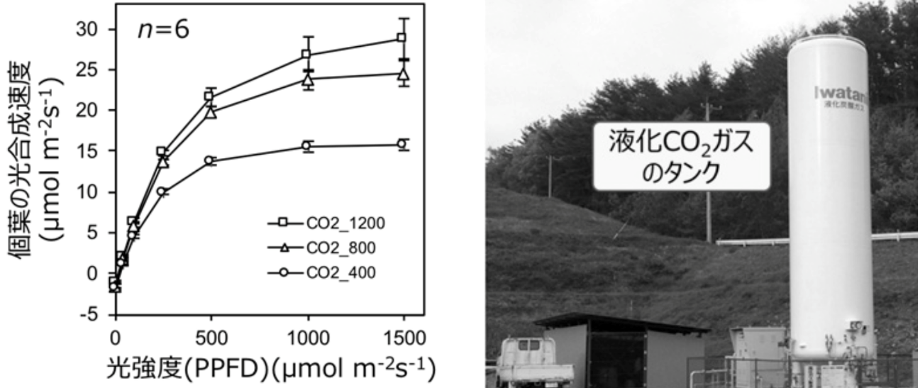 光強度が強い条件下においても、CO2施用効果は有効です。既に、日本国内でも一部の先端的太陽光の栽培施設においては、換気を行っている春季から夏季にかけても液化CO2ガスを用いたオランダをしのぐCO2施用(400〜600CO2/ha/h)が行われており、大幅な年間収穫量の増大を達成しているケースがあります。