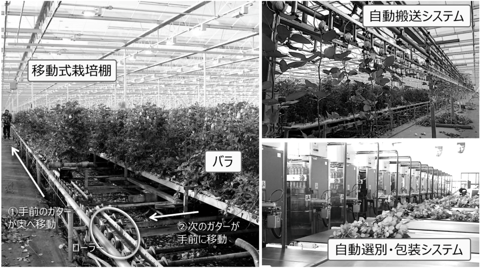 環境制御技術の活用の一方で、オランダの太陽光植物工場においてバラ栽培などを中心に、自動移動式栽培棚、自動搬送システム、自動選別・包装システムによる生産システム全体の自動化もおこなわれてきました。植物が定植されている栽培棚を移動させることで、作業者の移動時間を省き、作業通路を無くすことで実質的な栽培面積増大などのメリットがあり、これまで一定の成功を収めてきました。