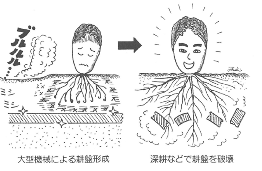 農作業の能率アップのためには大型トラクターなどの利用は避けられないので、土壌条件に応じて1〜2年に1回程度の割合で、深耕や心土耕による下層土の改善対策を講じましょう。