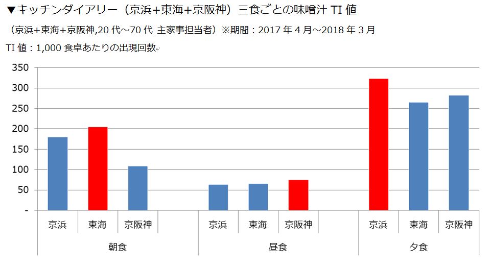 どのエリアも味噌汁のTI値が最も高いのは夕食、最も低いのは昼食という点は同じですが、三食(朝食/昼食/夕食)ごとにTI値が最も高いエリアは異なっている事が確認出来ました。最もTI値の高い夕食においては、京浜エリアが最も高い数値となっており、朝食では東海エリア、昼食では京阪神のTI値が最も高くなっています。