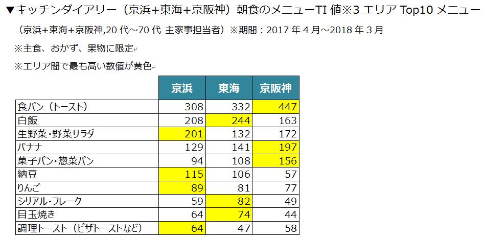 味噌汁のTI値が最も高い東海エリアは白飯のTI値が高く、朝食からしっかり”ご飯に味噌汁”という家庭が多いと推察できます。一方、京浜エリアは生野菜・野菜サラダのTI値が高いという特徴が確認されました。味噌汁のTI値が圧倒的に低い京阪神エリアは、朝食のメニューに強い特徴が出ています。食パン(トースト)や菓子パン・総菜パンといったパン系のメニューが他のエリアよりも高い傾向にあり、3エリアの中では最も朝に白飯を食べないエリアとなっています。