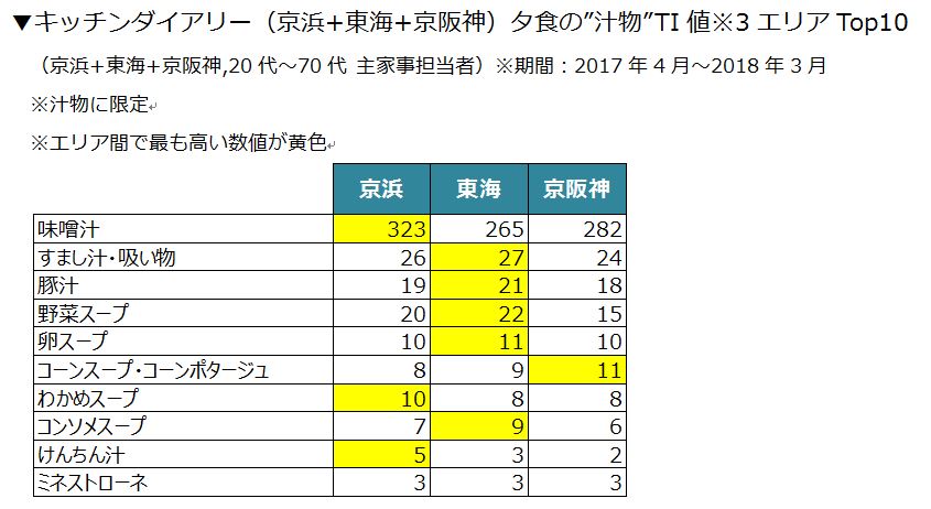 どのエリアも味噌汁が圧倒的ですが、味噌汁のTI値が最も低い東海エリアは、すまし汁、豚汁、野菜スープ、卵スープ等のTI値が他のエリアよりも高く、他のエリアよりも汁物のバラエティが豊富なエリアであると推察できます。