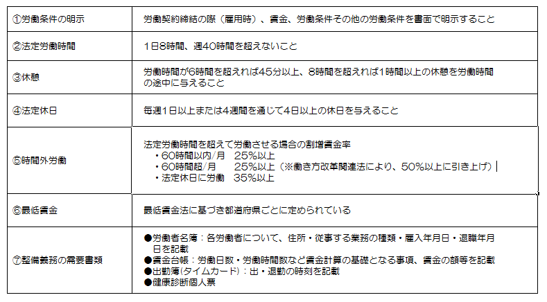 最低限守るべき労働条件に関する主な基準