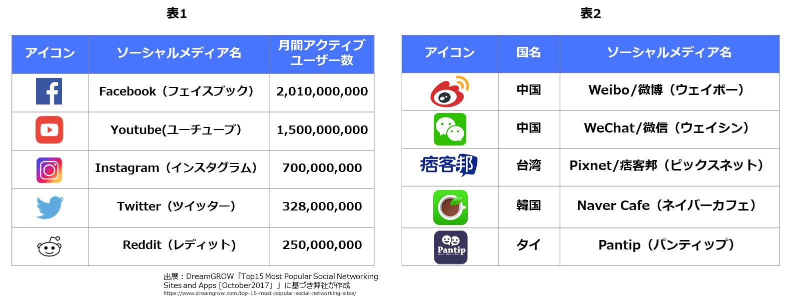 ソーシャルメディアやコンテンツマーケティングの情報サイトであるDream Growによると(表1)、2017年9月現在、世界でもっとも使われているソーシャルメディアはFacebookで、世界での利用者数が20億人を超えています。また、動画配信サイトのYouTubeは15億人、写真共有サイトであるInstagramは7億人、つぶやきを投稿するTwitterは3億人を超えています。世界で使われているトップのソーシャルメディアは日本にもなじみのあるものが多く、また。ソーシャルメディアがもともとアメリカから発展したことから、アメリカ発のソーシャルメディアが世界に普及しています。