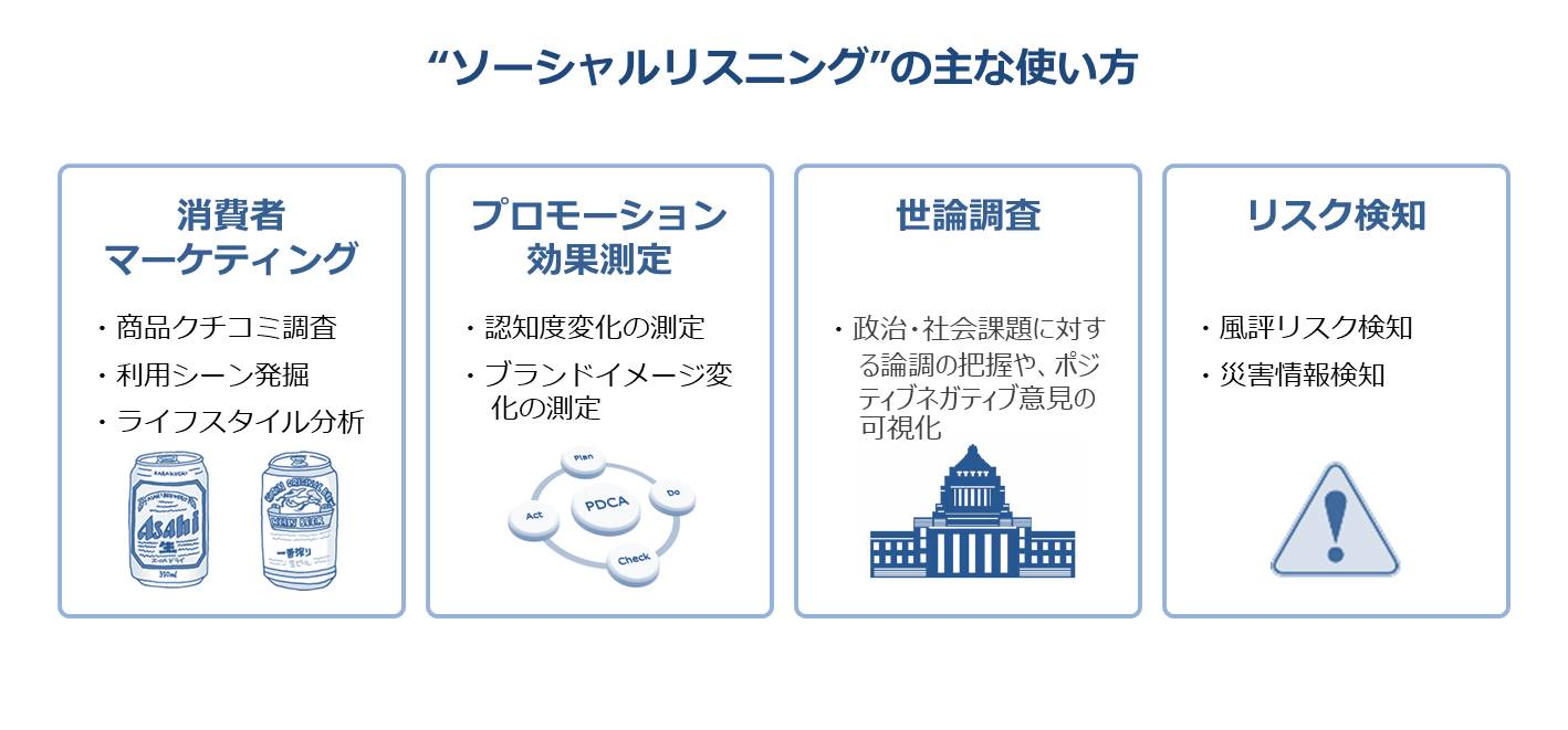 ソーシャルメディア上には、何億人という人々の発信・コミュニケーションが、膨大なデータとして蓄積されています。このソーシャルメディア上の情報は、昨今言われている「ビッグデータ」というものの一部で、その中に消費者や生活者の率直な意見や感想など、人々の本音が数多く眠っており「宝の山」と言われることもあります。ソーシャルリスニングは、こうした「宝の山」から、顧客が持つ商品・サービスのイメージや、消費者の隠れたインサイトなど、価値ある情報を発見する手法のことを指します。例えば、民間企業では、自社製品の改善点の掘り出し、従業員の投稿監視、製品の需要予測などを、膨大なデータの中から調査・分析を行い、その結果を基にして、これからのマーケティングや改善、プロモーション施策などに活用している企業も増えてきています。
