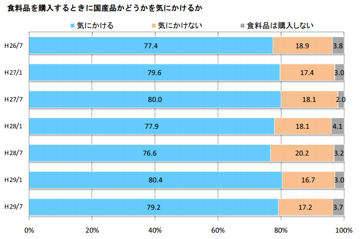 平成29年7月調査における食料品購入時に国産品を「気にかける」割合は79.2%。国産志向は平成26年調査以降8割程度と高い傾向が続いています。