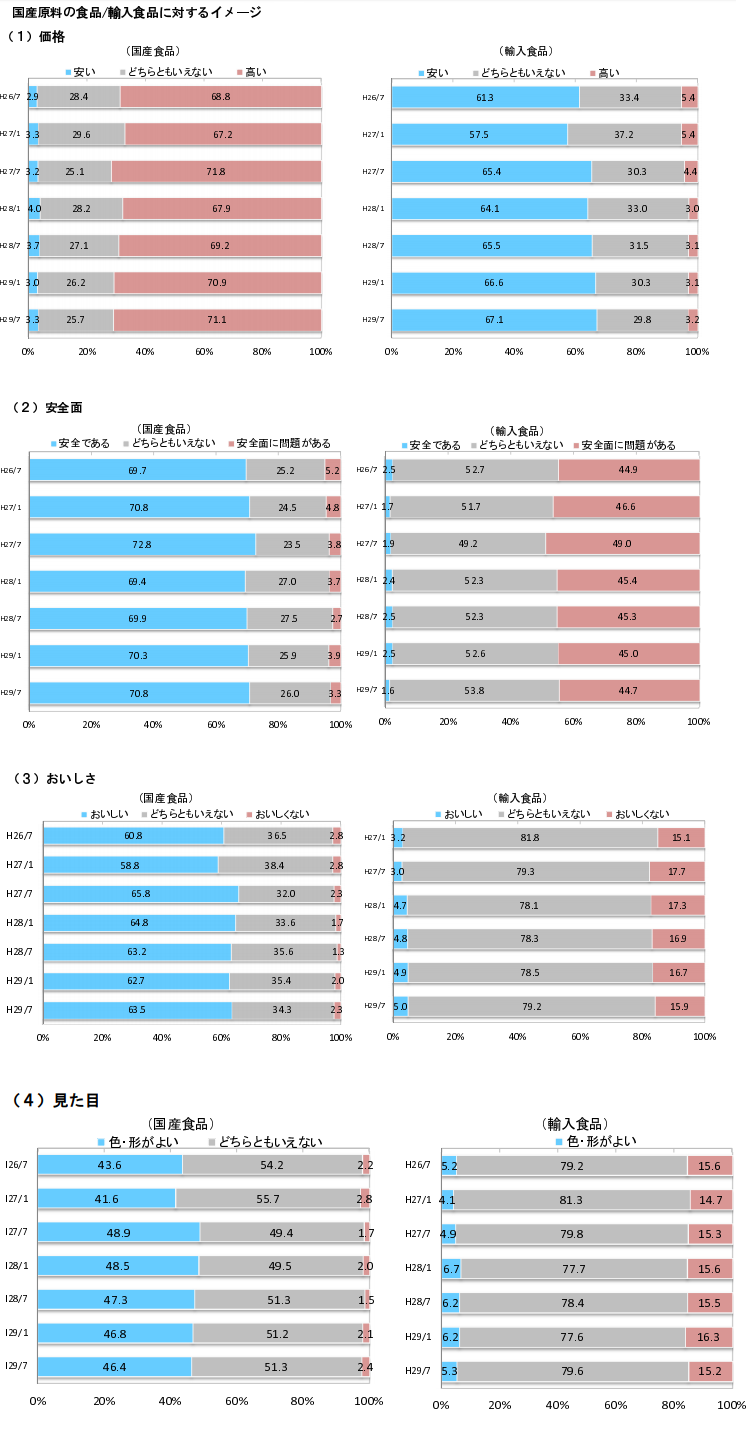 - 国産食品は「高い」「安全」「おいしい」、輸入食品は「安い」「安全性に問題がある」