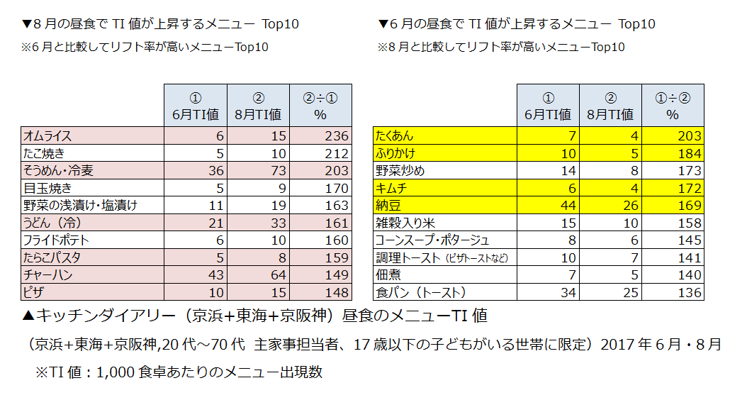 6月と比較した時に、「そうめん・冷麦」が8月に大きくリフトするのは季節性と見た方が良さそうですが、「オムライス」や「たらこパスタ」、「チャーハン」、「ピザ」といった単品でお腹を満たせるメニューのTI値が大幅に上昇しており、育ち盛りの子どもたちに対応した料理を出している様子が伺えます。