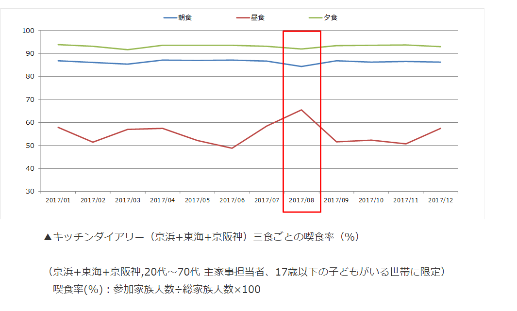 やはり子どもたちが夏休みに突入している8月は、昼食に子どもが参加する機会が増加するためか喫食率が60%を超え、1年で最も喫食率が高い月となっている事が確認できます。最も家庭での昼食喫食率が低いのは6月となっていますが、6月は国民の休日も無く、日中に会社や学校へ出ている確率が高いためと推察できます。