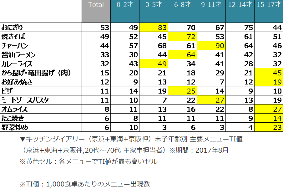 幼稚園児の年齢である3-5才の子どもがいる家庭では、「おにぎり」や「カレーライス」といったご飯系のメニューのTI値が高いという特徴が確認できますし、小学校低学年にあたる6-8才の子どもがいる家庭では「焼きそば」や「醤油ラーメン」といった麺類のTI値が高まっています。高校生にあたる15-17才になってくると「から揚げ・竜田揚げ」や「野菜炒め」といった大皿で出てくるようなメニューのTI値が高まっている事が確認できました。