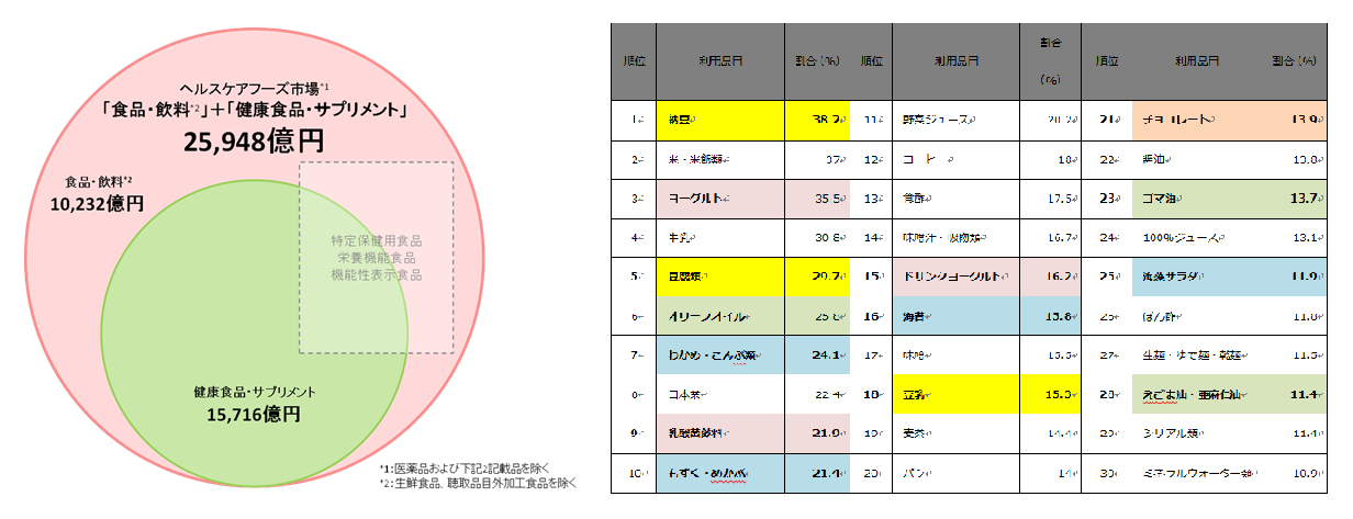 この2つの合計を「ヘルスケアフーズ市場」と定義し年間約2.6兆円のマーケットが存在する事が明らかになりました。