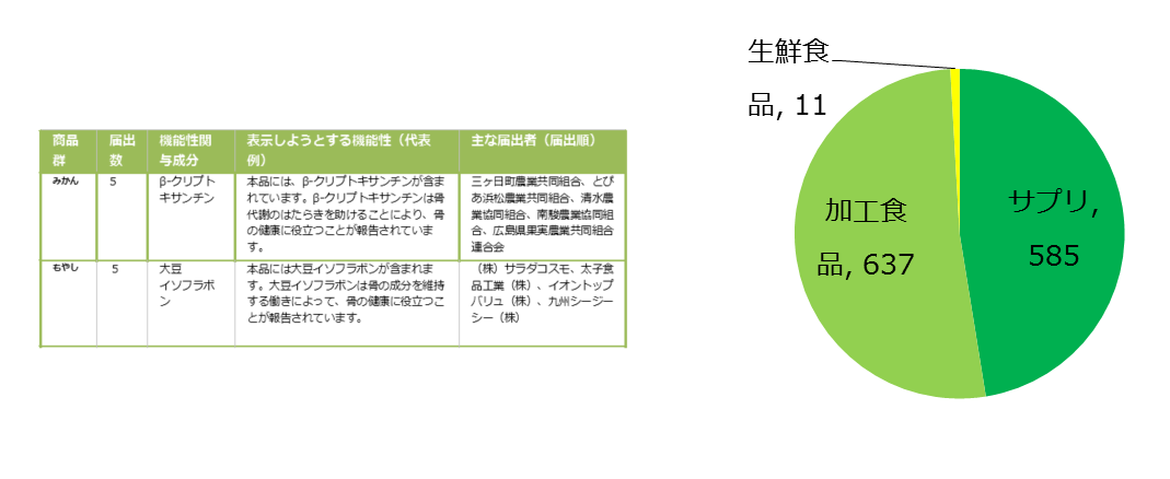 2018年1月9日時点で機能性表示食品は、1,233商品、届出社数は372社となっています。この、機能性表示食品には、サプリメント(いわゆる健康食品)、加工食品、生鮮食品の区分があり、上図のように飲料やヨーグルトを中心とする加工食品が全体の52%を占めています。わずかに届出がある生鮮食品は、農産物が主で「みかん」「もやし」にて、11件の商品届出があるのみです。因みにヘルスベネフィット(表示できる機能性)は共に「骨の健康」となっています。