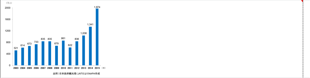 日本政府は2016年3月に「明日の日本を支える観光ビジョン」において2020年に4,000万人、2030年に6,000万人の目標に掲げている。2015年の訪日外国人数は前年比47.1%増の1,973万7千人になり、過去最高であった2014年の1,341万3千人を600万人余り上回った。そして2016年においては、9月末時点で訪日外客数はすでに約1,800万人となっており、過去最高を更新中である。