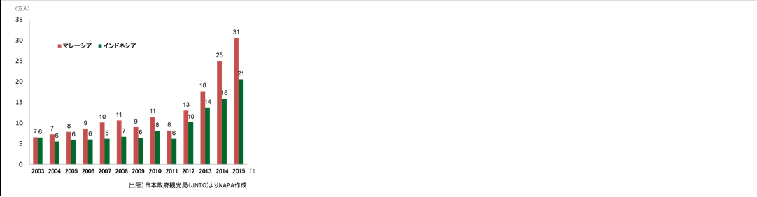 成長が著しい東南アジアにおいてムスリムの人口は7億5,000万人に上っている。日本政府観光局(JNTO)の調査によると、マレーシアからの訪日外国人観光客数は、2015年には305,500人と2014年の249,521人から22.4%と大幅に増加し過去最高を更新した。またインドネシアからの訪日外国人観光客数は、2015年には205,100人と、2014年の158,739人を29.2%上回り、こちらも過去最高を更新している。両国ともビザの免除による影響が大きく、今後さらなる増加が見込まれる。
