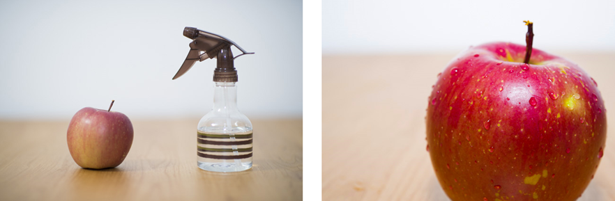 例えば、一度野菜や果物を水洗いしたり、霧吹きで水滴を吹きかけたりして、野菜や果物に少し水滴をつけます。するととてもみずみずしい野菜や果物に見えるようになります。トマトやナス、りんごやオレンジなど水分の多めの野菜は水滴でよりみずみずしさが増しますし、葉物の野菜も水滴がつくことによってより新鮮でおいしそうに見えます。