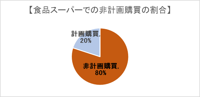 (公財)流通経済研究所が食品スーパーの店頭で実施した調査によると、1回の買い物で購入される商品のうち、約80%が非計画購買であった。これは、食品スーパーにおいて、カゴに入っている商品のうち、8割はお店の中で選定されているということである。消費者は売場で買う商品を決めているのである。