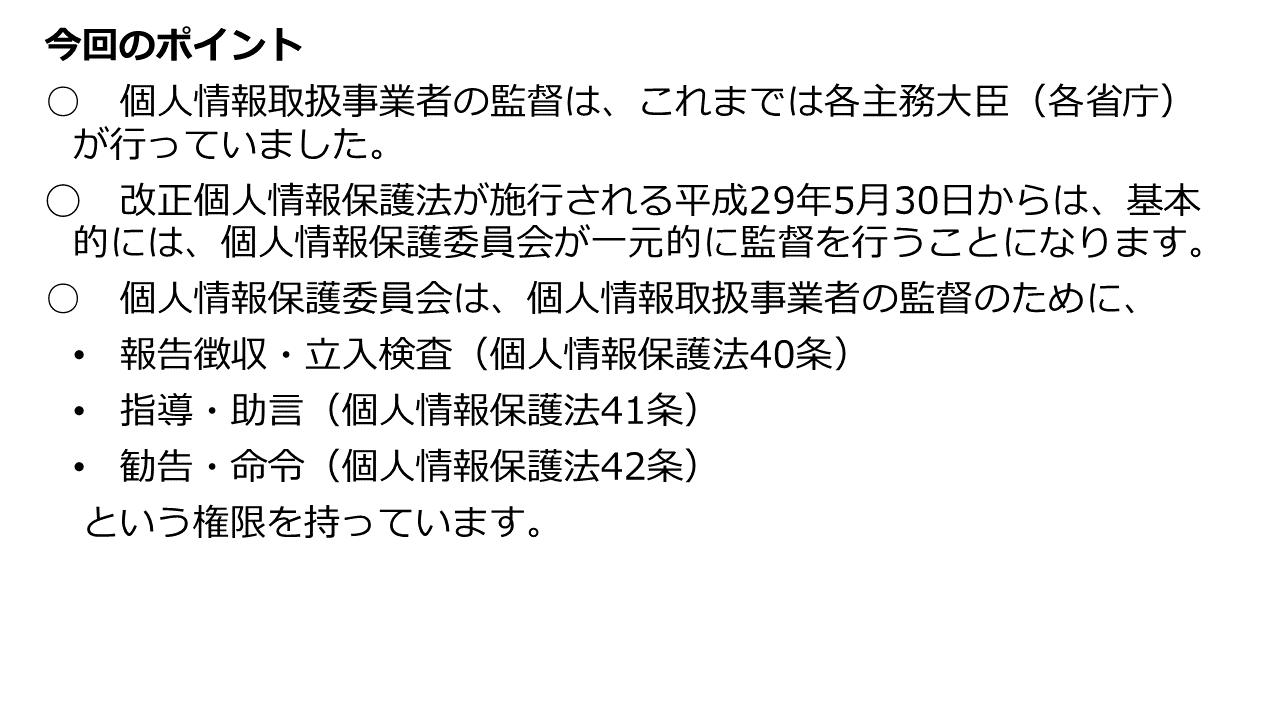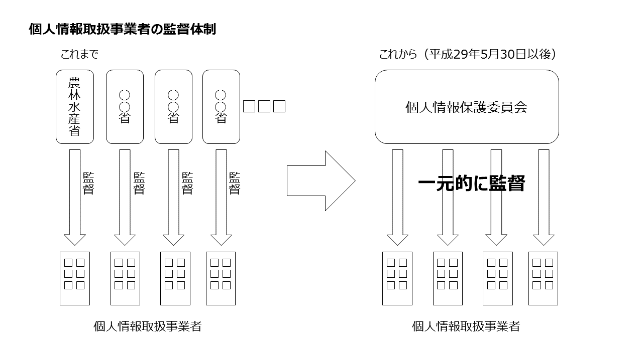 これに対し、改正個人情報保護法が施行された平成29年5月30日からは、基本的には個人情報保護委員会が一元的に監督を担うことになります。個人情報保護委員会というのは、マイナンバーの適正な取扱いの確保のために、平成26年1月1日に内閣府の外局として立ち上げられた、特定個人情報保護委員会を前身とする組織です。この「特定個人情報保護委員会」が、個人情報保護法の改正によって、マイナンバーだけでなく個人情報も担当することになり、平成28年1月1日から、「特定」が取れて「個人情報保護委員会」となりました。