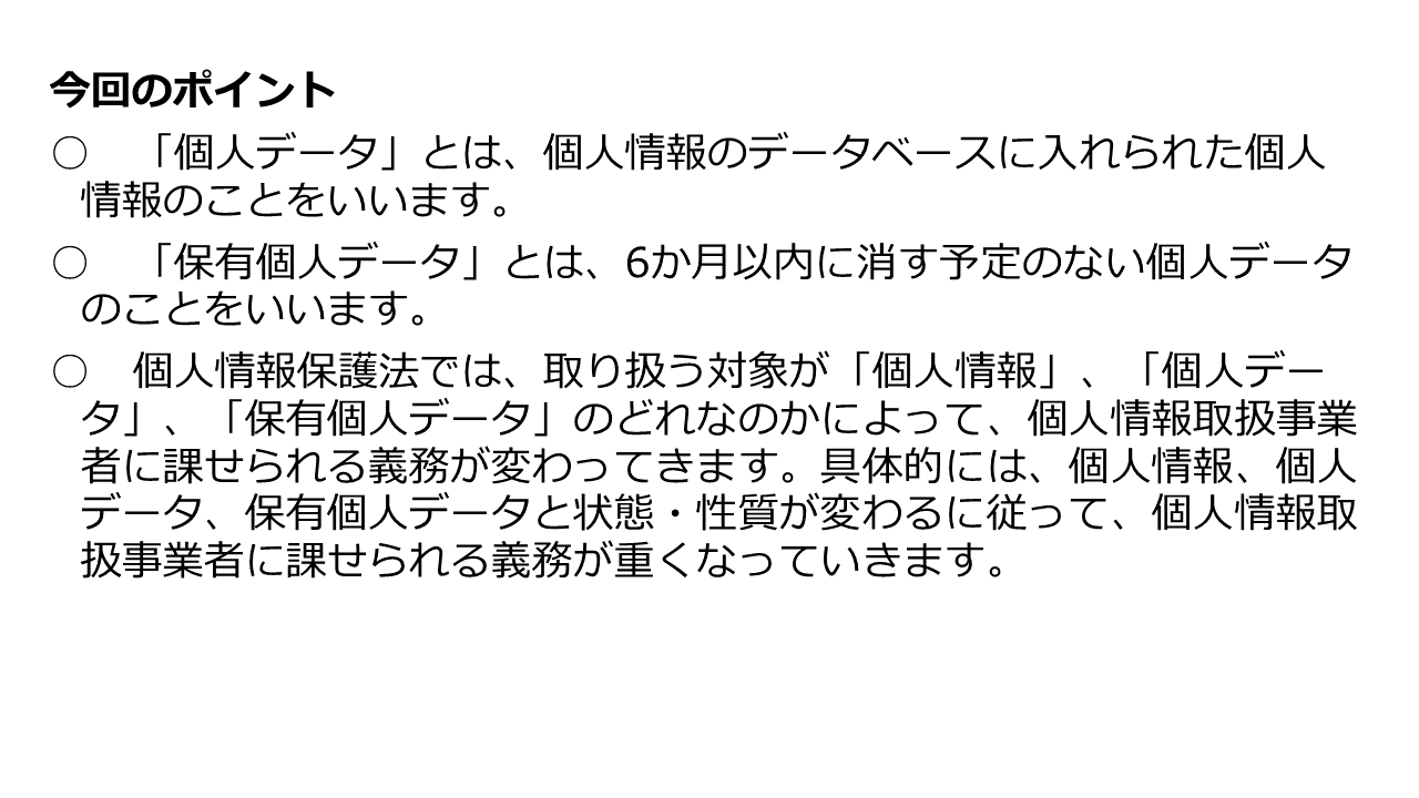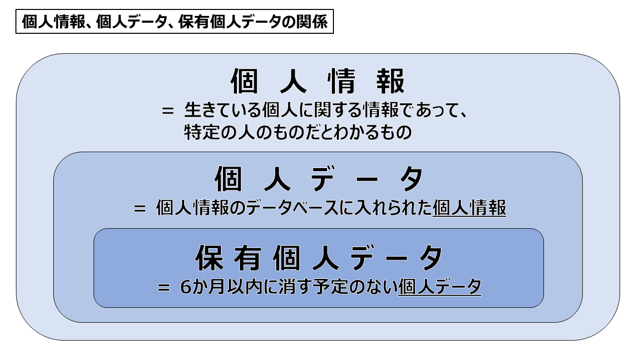 「個人情報」、「個人データ」、「保有個人データ」は、結局のところ、個人情報がどのような状態・性質であるかによって分かれている概念です。個人情報をデータベース化したら個人データになりますし、それが6か月以内に消す予定のないものであれば保有個人データになります。