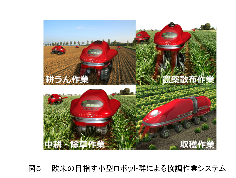 これら諸問題の解決には図5のような小さなロボットが群で協調しながら精密・高効率に作業を行うシステムが有効で欧米ではその研究開発が最近始まりました。実はこれは我々がSIP農業で進めているマルチロボットシステムと同じ発想です。世界の農業技術も目指すところは実は同じなのです。すなわち未来の農業技術は営農規模に応じた適正な機械のサイズという概念がなくなります。