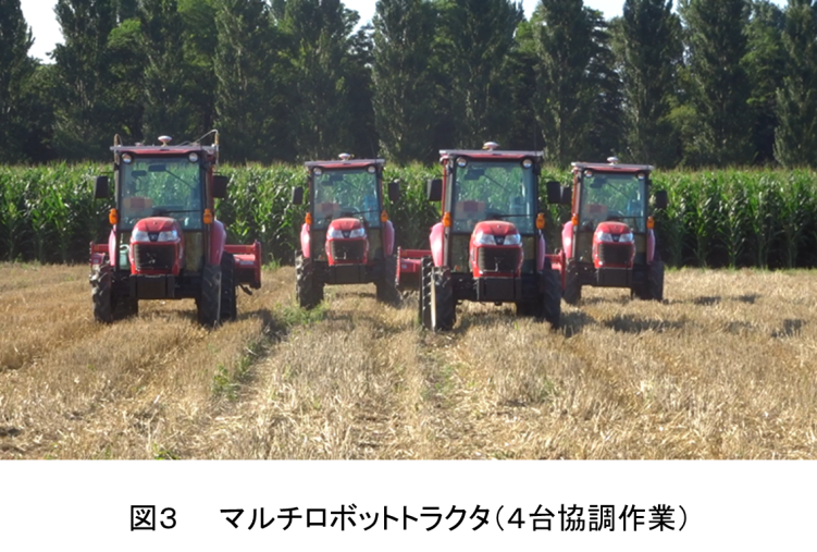 いま、我々の研究室ではさらに進んだロボット農機を開発中です。マルチロボットシステムと呼んでいますが、複数台の中型のロボットトラクタが相互に通信しながら協調して安全に農作業するロボットシステムです。3台のロボットトラクタが同じ作業を協調して行えば3倍の作業能率、5台が協調作業すれば5倍の能率になる技術です。図3はロボットトラクタ4台が協調作業していますが、台数に制限はありません。