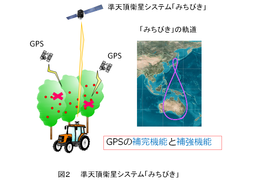 図1からわかるように北海道では急速に普及が進んでいます。そうなると本州の小区画でかつ分散した圃場で営農している農家さんは、このような農作業の自動化技術を導入することは無理ということでしょうか? そんなことはありません。いま日本政府が整備を進めている測位衛星システムに準天頂衛星システム「みちびき」があり、この技術が社会を大きく変えます。「みちびき」は2018年4月にサービスを開始する予定ですが、機能として高仰角から航法信号(軌道情報及び時刻情報)を提供するGPSの「補完機能」とGPSの測位精度を向上させる上で必要な補強信号を送信する「補強機能」を有します(図2)。