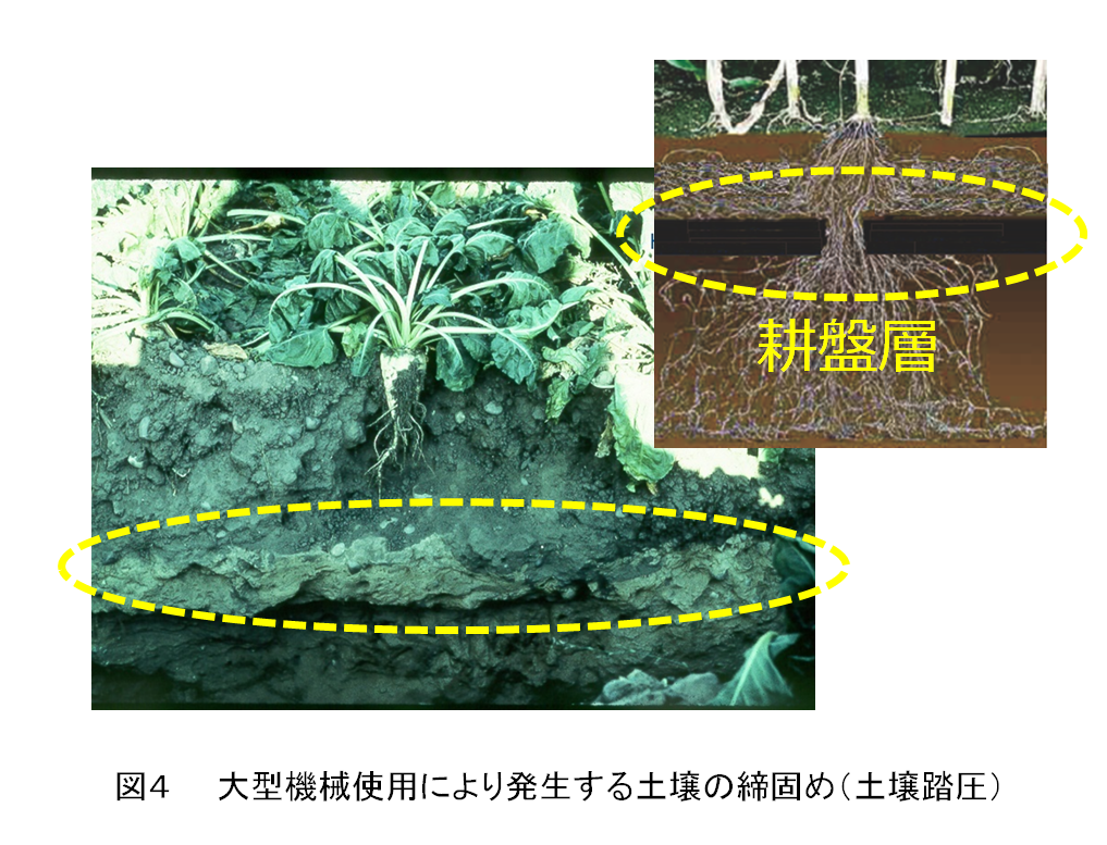 図4のように大型機械使用により作物の根の生育環境や圃場排水性を悪化させ、その対策として行われる心土破砕の消費エネルギが増大しました。EUの調査では農業生産に使用される石油エネルギの90%がこの心土破砕に費やされ、大型機械の使用が石油エネルギ消費の増加を引き起こしています。また、近年の気候変動によって降水量が増加し、大型トラクタや大型コンバインは圃場が湿りすぎて中に入れない日が増え作業に支障がでてきています。