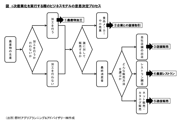 6次産業化とは、農林漁業者が自ら生産した農産物(1次)を、自ら加工(2次)し、自ら販売(3次)することによって、加工や販売における付加価値も農林漁業者の所得につなげるということである。一方、例えば、道の駅等で農産物を青果のまま最終消費者に販売するといった1次(生産)×3次(販売)の形態も6次産業化と捉えることができる。また、農産物をペースト状に加工して、その加工品を原料として食品加工メーカーに販売するといった1次(生産)×2次(加工)の形態も6次産業化と捉えられる。 このように、6次産業化を「農林漁業者の所得向上を図る方法」として考えてみると、1次×2次×3次だけでなく、1次×2次や1次×3次といった形態まで、幅広く捉えて考えることができる。言い換えると、6次産業化とは、生産者が食のサプライチェーン(供給網)に直接・間接的に関与し、同チェーン内の付加価値を享受することで生産者の所得向上を達成できる「生産者発のバリューチェーン(価値連鎖)モデル」と定義できる。