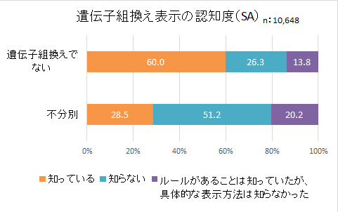 「遺伝子組換えでない」旨の表示に関する認知度は6割となっていますが、他方、 「不分別」である旨の表示に関する認知度は3割にとどまっています。