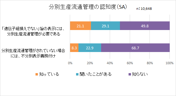 分別生産流通管理がされていない場合は、「遺伝子組換え不分別である」旨の表示が義務付けられていることを「知っている」は(8.3%)、「聞いたことがある」は(22.9%)。合計割合は(31.2%)であった。