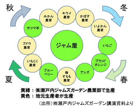 当社は2003年に周防大島にてジャム専門店をオープンし、2007年に農業部門を設立した。社長の松嶋匡史は奥様が周防大島出身という縁もあり、Iターンで周防大島へ移住し、ジャムを製造する一方で農業へも参入した。農業参入にあたり、地域で生産されているものは地域生産者(58戸)から仕入れ、地域内にないものを自社で栽培するなどきちんと役割分担をすることで、地域の農業との共生を図っている。また、6次産業化で一般的に言われている規格外品をジャムに加工するだけではなく、「ジャム加工専用栽培」というジャム加工専用に最適な果実栽培をしてもらうことで市場価格よりも高く買い取ることで地元生産者の所得の向上にも貢献している。