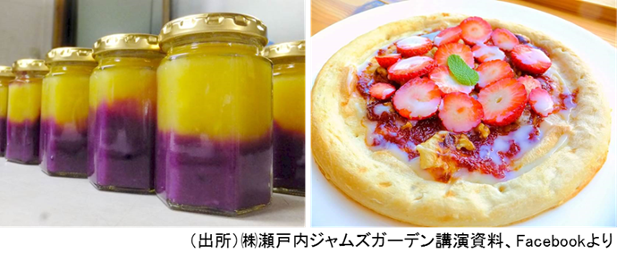 また、「ジャム作りの物語を楽しんでもらう!」ことをコンセプトに、パンにジャムを塗ってから焼く「焼きジャム」を使用した「ジャムピザ」、「カクテルジャム」をソーダで割る「マーマレードソーダ」を始め、島の事業者とコラボレーションをした「ジャム大福」や「豆腐プリンのジャムソースがけ」等を創作し、併設された瀬戸内海を一望できるカフェでそうした新しいジャムの食べ方を楽しんでもらうことで、来店者の消費マインドをアップさせる工夫をしている。