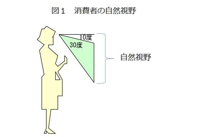 (公財)流通経済研究所が食品スーパーで実施した調査・実験において、消費者の視認性が良い陳列位置と、そうではない陳列位置では販売力に大きな差があることが分かっている。ここでいう視認性の良い陳列位置とは、消費者の自然視野に入る陳列位置を差す。なお、消費者の自然視野は目線よりもやや下になることに気を付けよう(図1)。