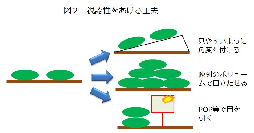 消費者から良く見える売り場にある商品は良く売れる。つまり、消費者に対して商品の視認性を向上させることができれば、売上を上げることができる可能性がある。視認性はちょっとした工夫で上げることができる。例えば、図2に示すように、平台にそのまま置くのではなく、売り場に居る顧客から見えやすいように、つまりは目立つように、商品の後ろにガイドなどを設けて角度を付けたり、陳列する商品にボリュームを持たせたり、商品の情報を表す告知物(POP)を付けたりすることで視認性を向上させることができる。