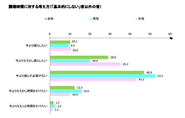 「調理時間」、約半数が現状のままで良い。女性の方が「時短」意識強い
