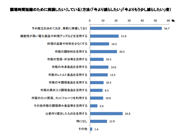 「予め献立を決めておき、事前に準備しておく」が半数以上の 54.7%で最多。次いで「以前作り置きしたものを活用」が24.8%、「機能性が高い電化製品や料理グッズなどを活用」が21.8%、市販の調味料活用20.5%となった。