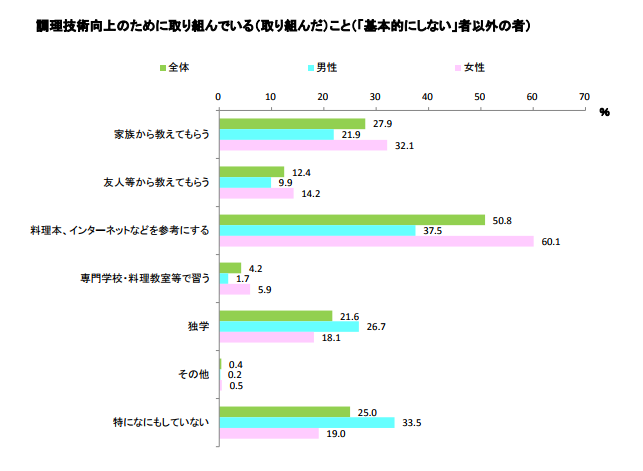 「料理本やインターネットなどを参考にする」が 50.8%で最多となった。2番目の「家庭内での料理技術の継承(「家族から教えてもらう」)は、27.9%と3割以下に留まった。