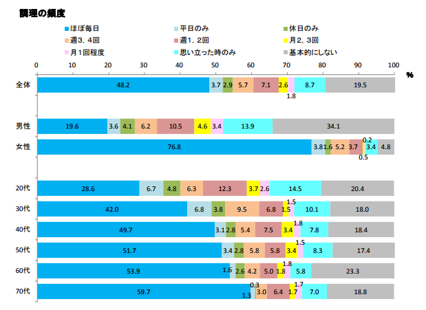 - 毎日調理する人は5割、調理しない人は2割。家庭内における調理者は女性中心