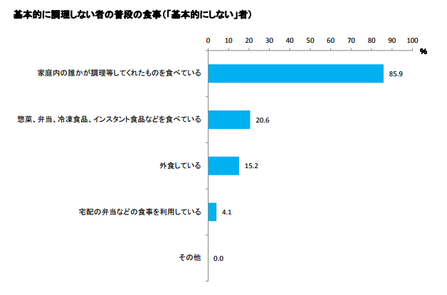 - 調理しない人は、8割以上が家庭内の誰かが調理してくれたものを食べている