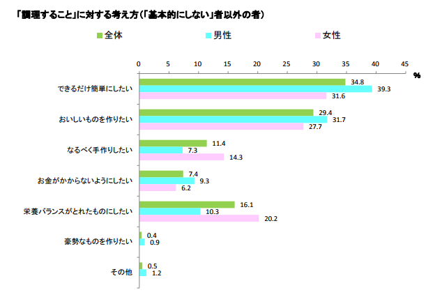 性別で比較すると、男女間で上位3項目の順位は変わらないものの、「栄養バランスがとれたものにしたい」(女性20.2%、男性10.3%)、「なるべく手作りしたい」(女性14.3%、男性7.3%)の項目では、女性が男性よりも顕著に高くなっている。一方、「できるだけ簡単にしたい」は(女性31.6%、男性39.3%)と、男性が女性よりも高い傾向。