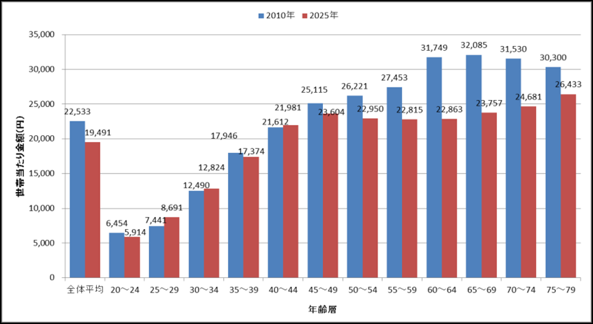 コメの一世帯あたりの年間消費金額は、全体で 2010年の22,533円から2025年には19,491円と3,042 円減少する予測である。年齢別では、45歳以上の年代すべてで消費金額の減少がみられ、中でも60代の落ち込みが大きい。60代前半で年間9千円近く、60代後半で8千円以上の下落予測である。2025年に60代前半となるのは1980年代バブル経済期に20代前半だった俗に言う「新人類世代」である。