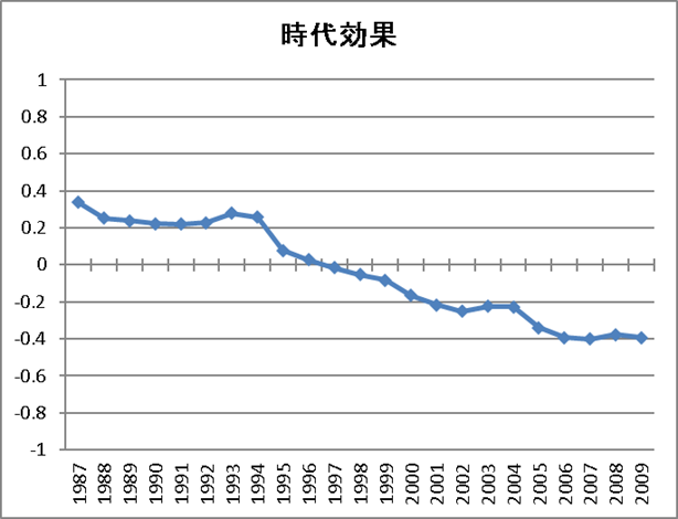 時の経過に従って低くなっている。つまり、時代が進むに連れてコメ消費金額が少なくなっている、ということである。 1993-1994年に一時的に時代効果が上昇しているのは、平成の米騒動が主因であると考えられる。